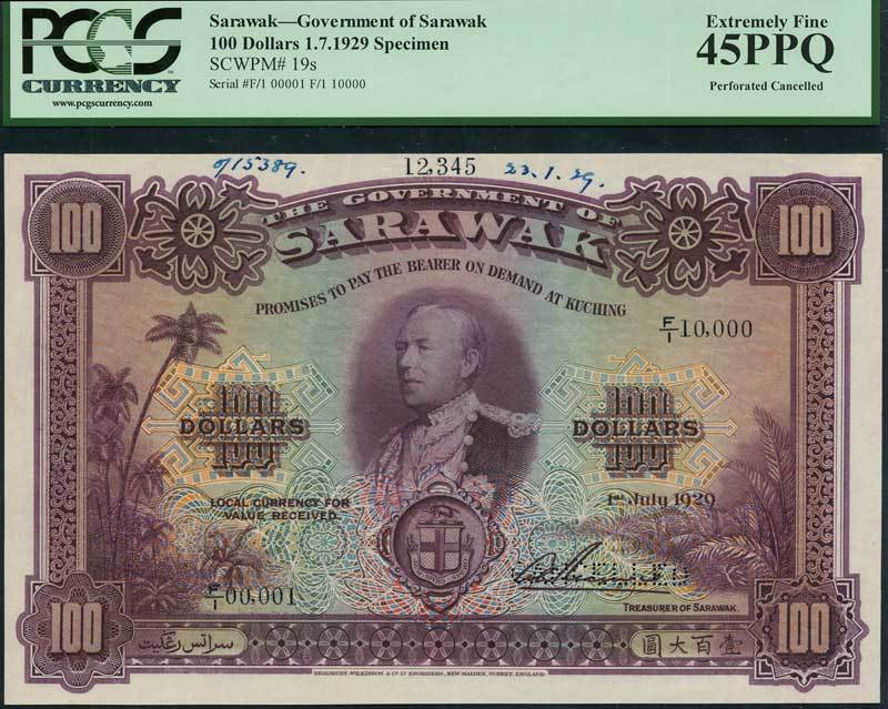 Government of Sarawak, specimen $100, 1 July 1929, serial number F/1 00001-F/1 10000, purple and multicoloured, Charles Vyner Brooke at centre, arms below, fronds and palm trees at left and right, value at centre and at each corner, signature of Arthur Rennie low right, reverse purple and white, value at centre, stylized bird and snake at left and right, perforated CANCELLED