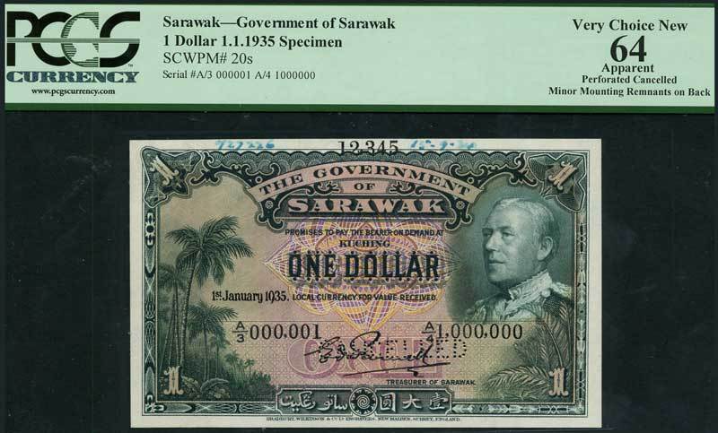 Government of Sarawak, specimen $1, 1 January 1935, serial number A/3 000001-A/4 1000000, green and multicoloured, Charles Vyner Brooke at right, fronds below, palm trees at left, value at centre and at each corner, signature of Edward Parnell low centre, reverse green and white, arms at centre, value and ornate staff at left and right, perforated CANCELLED