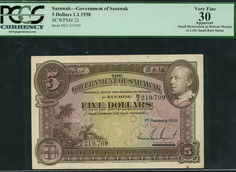 Government of Sarawak, $5, 1 January 1938, serial number B/2 219709, brown and multicoloured, Charles Vyner Brooke at right, palm trees at left, value at centre and at each corner, signature of Calvert low right, black bar overprint low right, reverse brown, value at centre