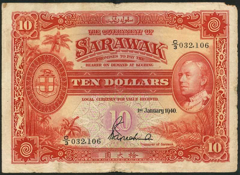 Government of Sarawak, $10, 1 January 1940, serial number C/3 032106, red and multicoloured, Charles Vyner Brooke at right, arms at left with palm trees, value at centre and at left and right, signature of Trechman low centre, reverse red, the Brooke memorial and the Old Court House Kuching at centre, value at left and right