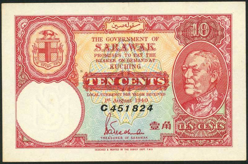 Government of Sarawak, 10 cents, 1 August 1940, serial number C 411824, red and pale blue and orange, Charles Vyner Brooke at right, arms top left, Trechman signature low centre, reverse blank