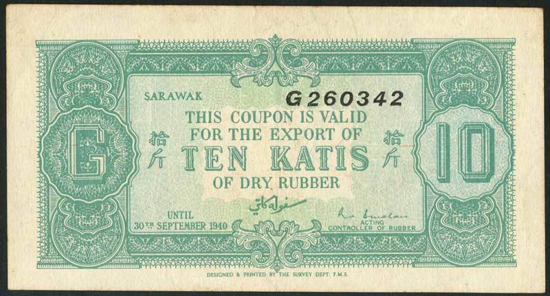 Rubber Export Coupons, Sarawak, 5 katis (3), 1940,1941,1942, green/blue, 10 katis (3), 1940,1941,1942, green/lilac/blue