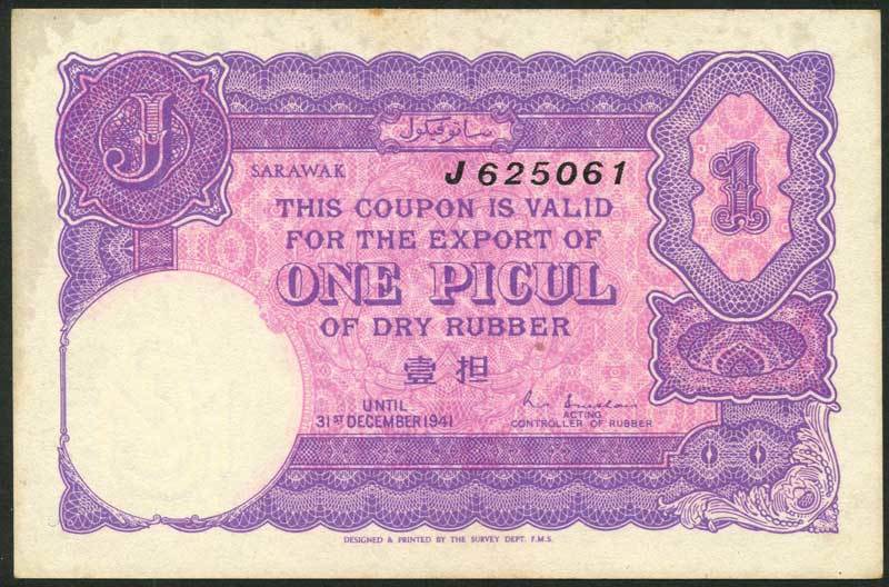 Rubber Export Coupons, Sarawak, 25 katis (3), 1940,1941,1942, green/lilac/blue, also 1 picul (3), 1940,1941,1942, green/lilac/blue