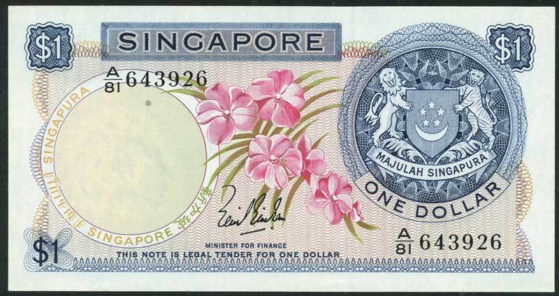 Board of Commissioners of Currency, Singapore, $1 (3), ND (1967-), prefixes A/81, B/24 and C/90, blue and purple, Vanda Janet Kaneali orchid at centre, Lim Kin San, Goh Keng Swee and Hon Sui Sen signatures respectively, reverse blue, public housing
