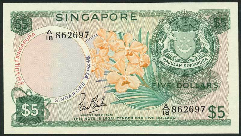 Board of Commissioners of Currency, Singapore, $5 (2), ND (1967/1973), prefix A/18 and A/36, green and purple, Vanda TMA orchid at centre, Lim Kim San and Hon Sui Sen with red seal signatures, reverse green, Singapore river, boats and buildings