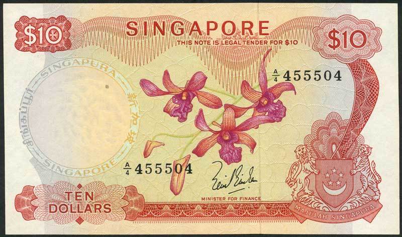 Board of Commissioners of Currency, Singapore, $10 (5), ND (1967-), prefix A/4,A/65,A/73,A/84,B/60, red and multicoloured, Dendrobium Marjorie Ho 'Tony Pek' orchid at centre, arms low right, signatures of Lim Kin San (2), Goh Keng Swee (2), Hon Sui Sen no seal, Hon Sui Sen red seal