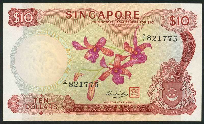 Board of Commissioners of Currency, Singapore, $10, ND (1967-), serial number Z/1 821775, red and multicoloured, Dendrobium Marjorie Ho 'Tony Pek' orchid at centre, arms low right, signature of Hon Sui Sen with red seal