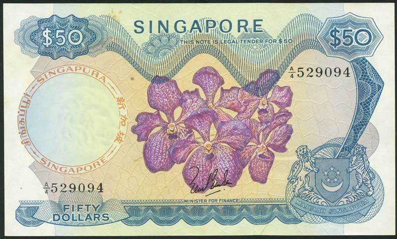 Board of Commissioners of Currency, Singapore, $50, ND (1967-), serial number A/4 529094, blue and multicoloured, Vanda Rothscildiana 'Teo Choo Hong' orchid at centre, arms low right, signature of Lim Kin San low centre, reverse blue, Clifford pier and seafront
