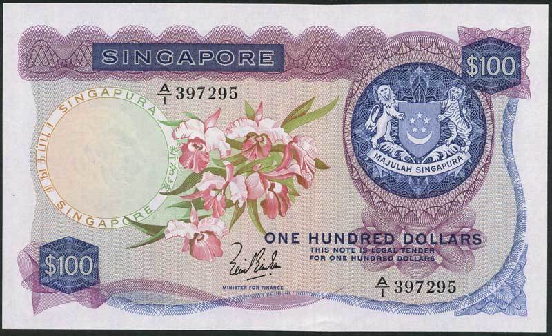 Board of Commissioners of Currency, Singapore, $100, ND (1967), serial number A/1 397295, blue and mauve, Cattleya orchid at centre, Lim Kim San signature, reverse blue, sail boat