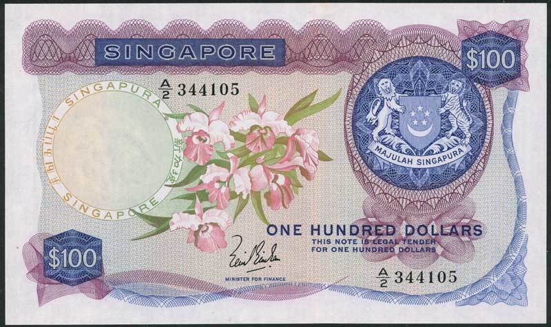 Board of Commissioners of Currency, Singapore, $100, ND (1967-), serial number A/2 344105, blue and mauve, Cattleya orchid at centre, arms top right, signature of Lim Kin San low centre, reverse blue, boats and seafront