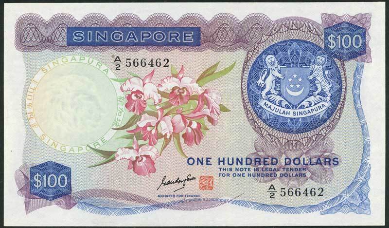 Board of Commissioners of Currency, Singapore, $100, ND (1970), serial number A/2 566462, blue and mauve, Cattleya orchid at centre, Goh Keng Swee signature, red seal, reverse blue, sail boat