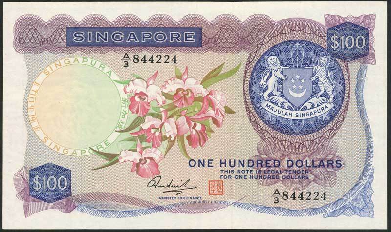 Board of Commissioners of Currency, Singapore, $100 (2), ND (1972/3), serial number A/2 863416 and A/3 844224, blue and mauve, Cattleya orchid at centre, Hon Sui Sen signatures, second red seal, reverse blue, sail boat