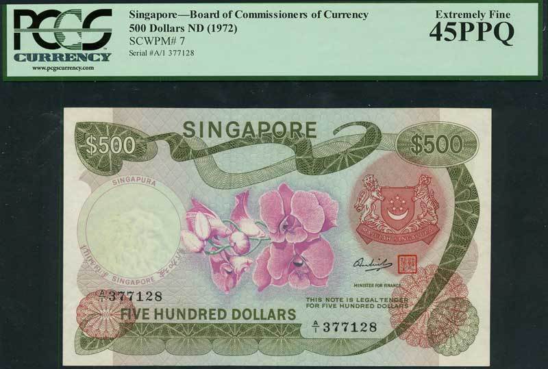 Board of Commissioners of Currency, Singapore, $500, ND (1972-), serial number A/1 377128, green and multicoloured, Dendrobium Shangri-La orchid at centre, arms top right, signature of Hon Sui Sen, red seal low centre, reverse green, Government building