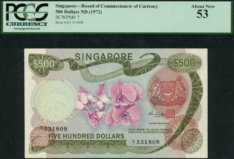 Board of Commissioners of Currency, Singapore, $500, ND (1967), serial number A/1 531808, green and pink, Dendrobium Shangri-La orchid at centre, coat of arms at right, red seal at right, Hon Sui Sen signature, reverse green, Government building