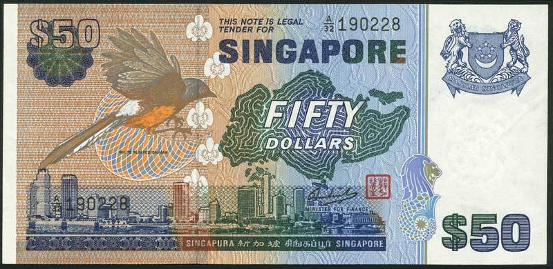 Board of Commissioners of Currency, Singapore, $1, ND (1976-), prefix B/92, blue and pink, Black-Naped Tern at left, $5, ND (1976), prefix A/14, green and yellow, Red Whiskered Bulbul at left and $10, ND (1976), red, White-Collared Kingfisher at left, $20, ND (1979), prefix A/4, yellow, Yellow-Breasted Sunbird at left, $50, ND (1976), prefix A/32, blue, White-Rumped Shama at left, all arms top right and signature of Hon Sui Sen and red seal low right centre