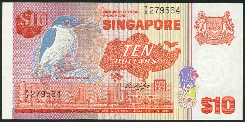 Board of Commissioners of Currency, Singapore, $10, ND (1976-), serial number Z/1 279564, red, White-Collared Kingfisher at left, arms at right, signature of Hon Sui Sen and red seal low right centre