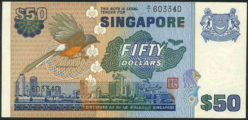 Board of Commissioners of Currency, Singapore, $50, ND (1976), serial number A/1 603340, blue and tan, White-rumped Shama bird at left, arms top right, city view below