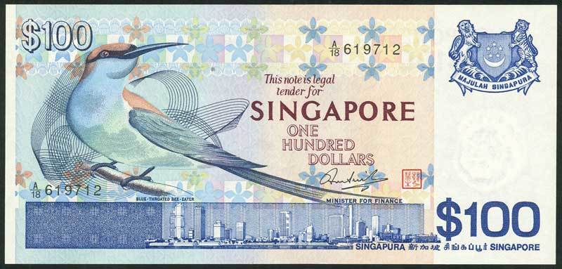 Board of Commissioners of Currency, Singapore, $100, ND (1977), serial number A/18 619712, blue and multicoloured, Blue-Throated Bee-Eater at left, view of Singapore low centre, arms top right, signature of Hon Sui Sen and red seal low right centre, reverse blue and pink, dancers