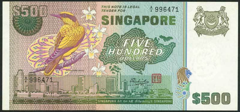 Board of Commissioners of Currency, Singapore, $500, ND (1976), serial number A/4 996471, green and multicoloured, Black-naped Oriole at left, arms top right, city view below, Hon Sui Sen and red seal