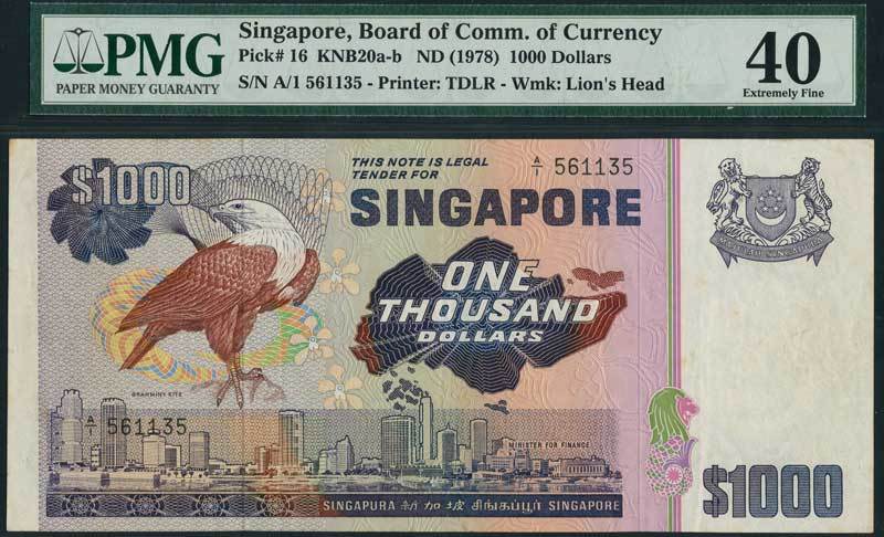 Board of Commissioners of Currency, Singapore, $1000, ND (1978), serial number A/1 561135 blue and multicoloured, Brahminy kite at left, arms top right, city view below, Hon Sui Sen and red seal