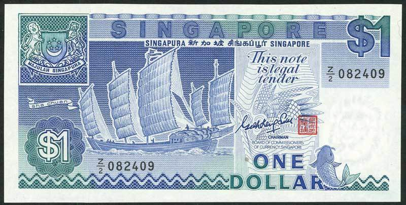 Board of Commissioners of Currency, Singapore, $1 (3), ND (1987/1988), prefixes A/9,Z/1,Z/2, blue and green, 'Sha Chuan' four masted boat at left, arms top left, signature of Goh Keng Swee at right, also $1 (2), prefixes D/15, Z/2, as previous but Hu Tsu Tau signature