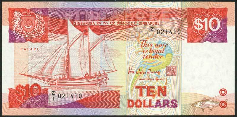 Board of Commissioners of Currency, Singapore, $10 (2), ND (1988), prefixes A/1 and Z/1, red and multicoloured, Palari boat at left, arms top left, signature of Hu Tsu Tau