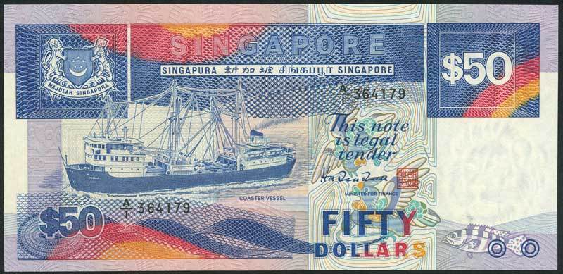 Board of Commissioners of Currency, Singapore, $50 (3), 1987, serial number A/1 364177/178/179, blue, 'Perak' coaster ship at left, arms top left, Doctor Hu Tsu Tau signature and red seal
