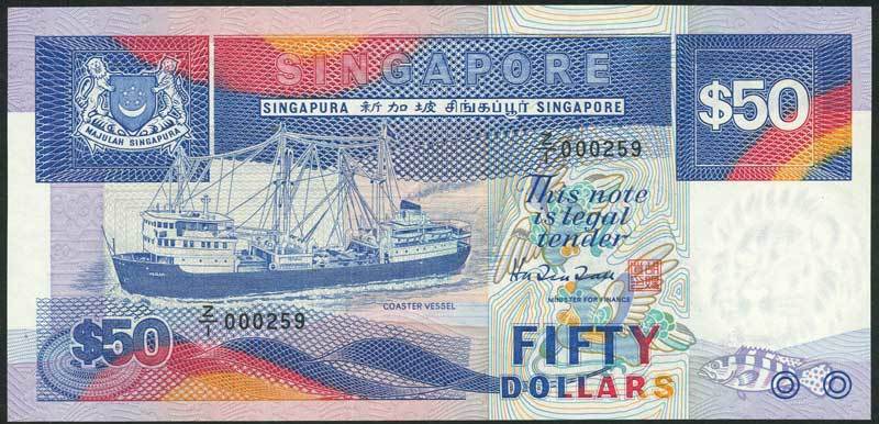 Board of Commissioners of Currency, Singapore, $50, ND (1987), serial number Z/1 000259, blue and multicoloured, coaster ship at left, arms top left, signature of Hu Tsu Tau