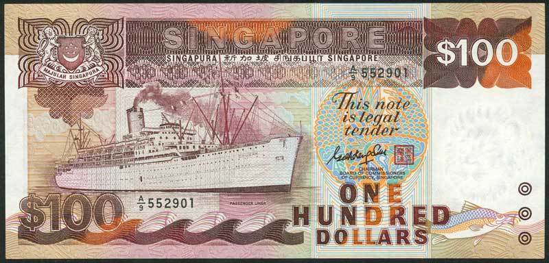 Board of Commissioners of Currency, Singapore, $100 (2), 1985, prefixes A/1 and A/9, brown, 'Chusan' passenger ship at left, arms top left, Goh Keng Swee signature and red seal
