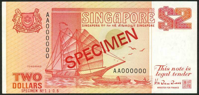Board of Commissioners of Currency, Singapore, specimen $2, ND (1991), serial number AA000000, red and yellow, Tongkang sailboat at centre, coat of arms at left, R. Hu Tsu tau signature, red SPECIMEN overprint