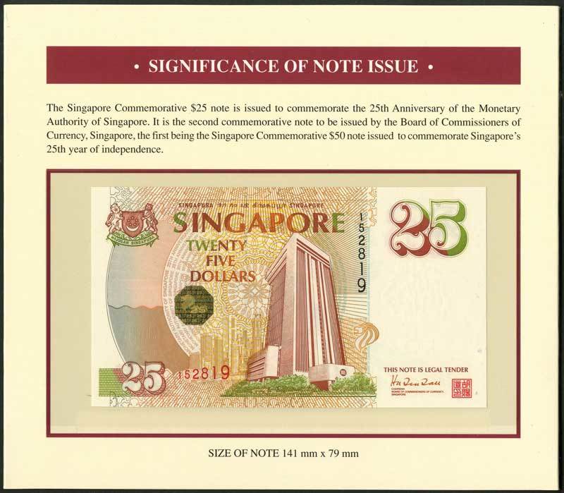 Board of Commissioners of Currency, Singapore, presentation folders (2) containing a sheet of 3x$2, 1991. also a presentation folder for a $25 commemorating the 25th anniversary of the Monetary Authority of Singapore