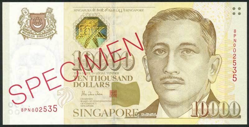 Board of Commissioners of Currency, Singapore, specimen $10000, ND (1999), serial number 8PN002535, pale olive with gold hologram, Yusuf bin Ishak at right, Doctor Hu Tsu Tau signature