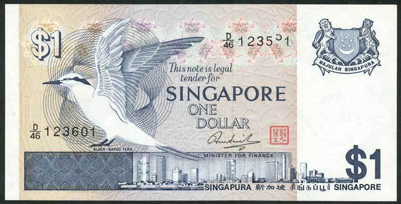 Board of Commissioners of Currency, Singapore, $1, ND (1976), serial number D/46 123601/123551, blue and pale tan, Black Naped Tern at left, city view at centre, arms top right, signature of Hon Sui Sen and red seal