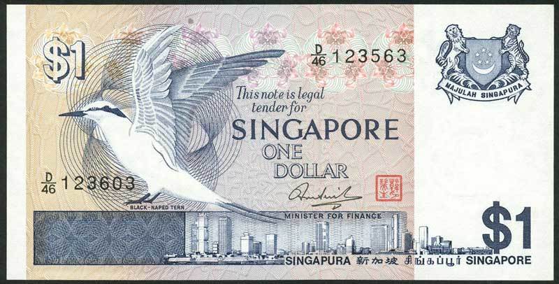 Board of Commissioners of Currency, Singapore, $1, ND (1976), serial number D/46 123603/123563, blue and pale tan, Black Naped Tern at left, city view at centre, arms top right, signature of Hon Sui Sen and red seal
