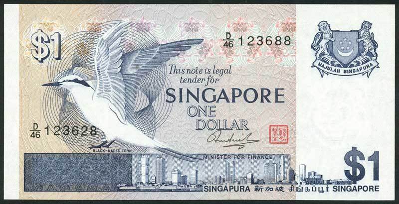 Board of Commissioners of Currency, Singapore, $1 (2), ND (1976), serial number D/46 123629/123699, blue and pale tan, Black Naped Tern at left, city view at centre, arms top right, signature of Hon Sui Sen and red seal