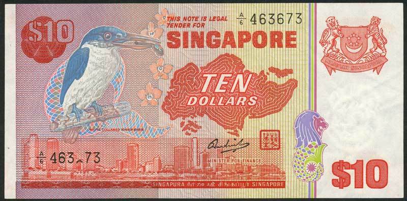 Board of Commissioners of Currency, Singapore, $10 (2), ND (1976), serial number A/6 463672-463673, red and multicoloured, White-Collared Kingfisher at left, city view at centre, arms top right, signature of Hon Sui Sen and red seal low right centre, reverse Merlion and city buildings