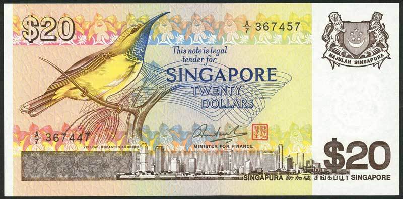 Board of Commissioners of Currency, Singapore, $20, ND (1979), serial number A/7 367447/367457, yellow and multicoloured, Yellow-Breasted Sunbird at left, view of Singapore low centre, arms top right, signature of Hon Sui Sen and red seal low centre, reverse Concorde