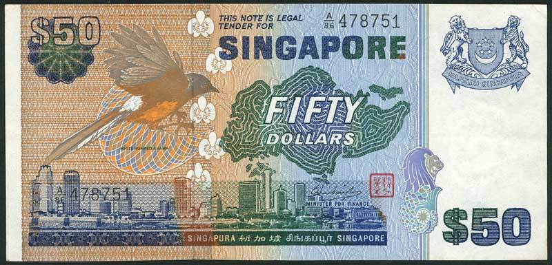Board of Commissioners of Currency, Singapore, $50, ND (1976), serial number A/86 478751, blue and multicoloured, White-Rumped Shama bird at left, view of Singapore low field, arms top right, signature of Hon Sui Sen with red seal low right centre, reverse school band