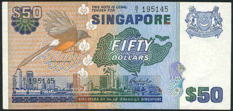 Board of Commissioners of Currency, Singapore, $50, ND (1976), serial number B/3 195145, blue and multicoloured, White-Rumped Shama bird at left, view of Singapore low field, arms top right, signature of Hon Sui Sen, reverse school band
