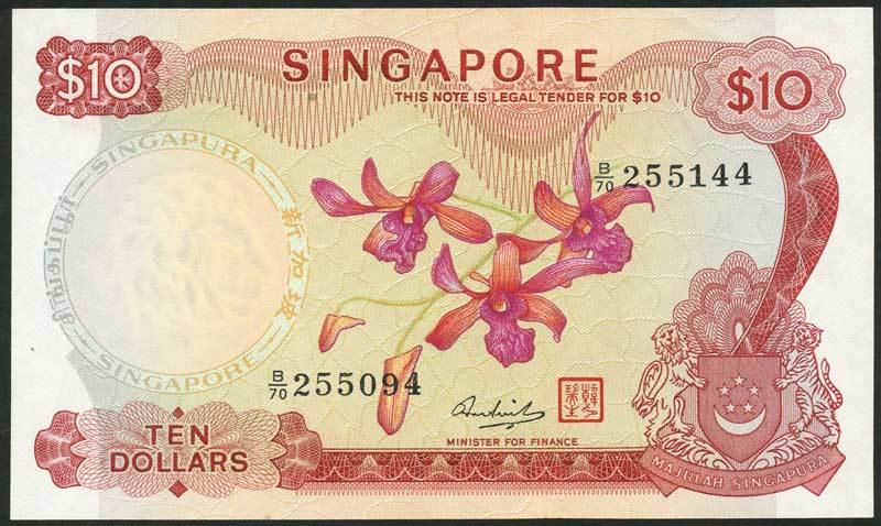 Board of Commissioners of Currency, Singapore, $10 (2), ND (1973), serial number B/70 255093/255143 and 255094/255144, red and pale green and orange, Dendrobium Marjorie Ho 'Tony Pek' orchid at centre, arms low left, signature of Hon Sui Sen and red seal low centre