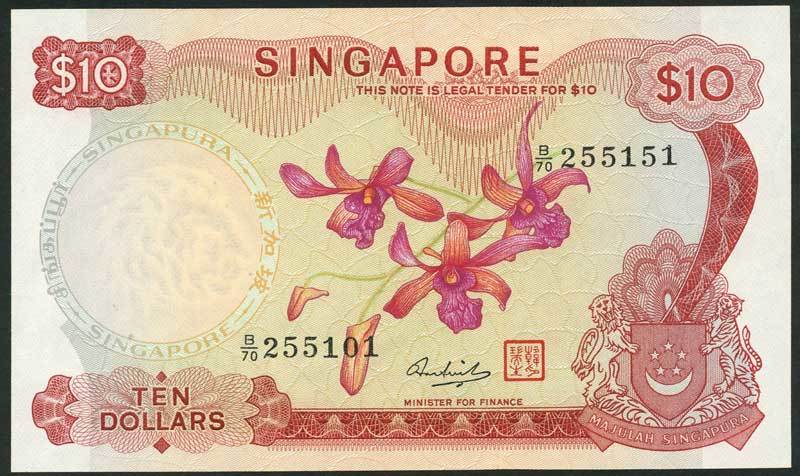 Board of Commissioners of Currency, Singapore, $10, ND (1973), serial number B/70 255101/255151, red and pale green and orange, Dendrobium Marjorie Ho 'Tony Pek' orchid at centre, arms low left, signature of Hon Sui Sen and red seal low centre