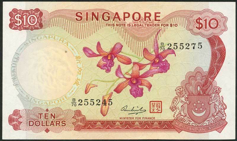 Board of Commissioners of Currency, Singapore, $10, ND (1973), serial number B/70 255245/255275, red and pale green and orange, Dendrobium Marjorie Ho 'Tony Pek' orchid at centre, arms low left, signature of Hon Sui Sen and red seal low centre
