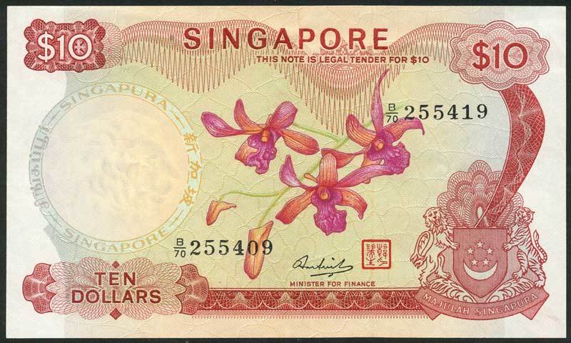 Board of Commissioners of Currency, Singapore, $10, ND (1973), serial number B/70 255409/255419, red and pale green and orange, Dendrobium Marjorie Ho 'Tony Pek' orchid at centre, arms low left, signature of Hon Sui Sen and red seal low centre