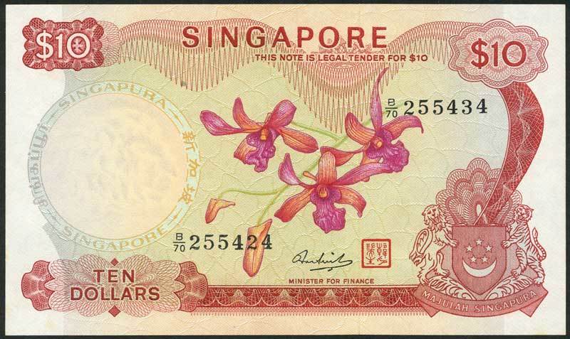 Board of Commissioners of Currency, Singapore, $10, ND (1973), serial number B/70 255424/255434, red and pale green and orange, Dendrobium Marjorie Ho 'Tony Pek' orchid at centre, arms low left, signature of Hon Sui Sen and red seal low centre