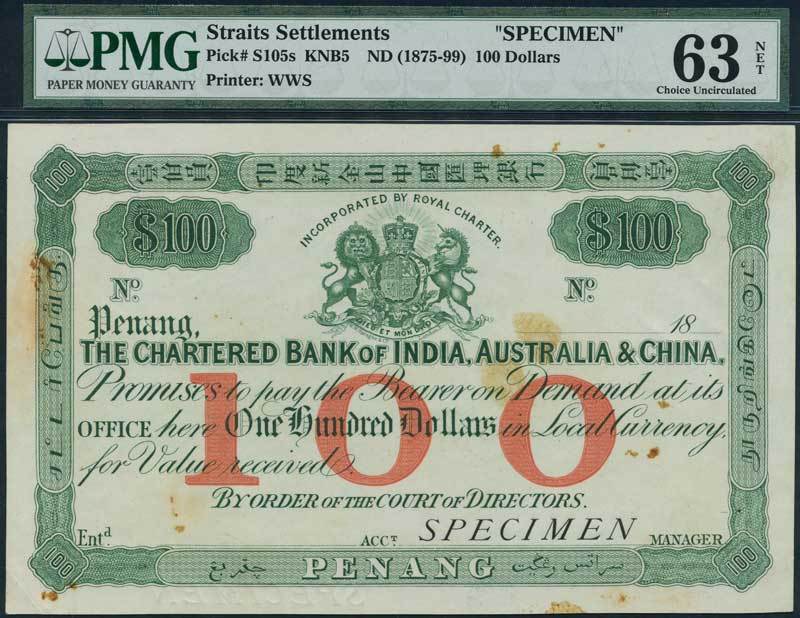 Chartered Bank of India, Australia & China, Straits Settlements, specimen $100, Penang, 18- (1875-99), green and red, arms at top centre, value in red in underprint, and at top left and right, reverse green, crown at top centre, sailing boats at low centre