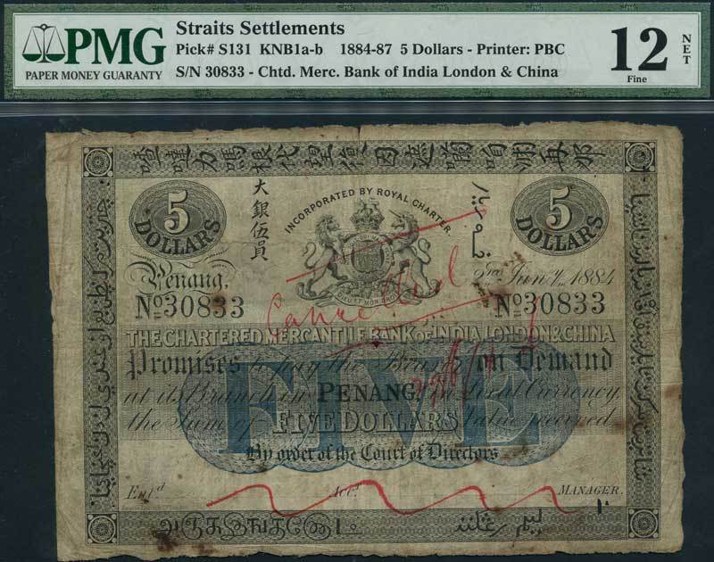 Chartered Mercantile Bank of India, London & China, Straits Settlements issue, $5, 1884, Penang, serial number 30833, black and blue, bank crest top centre, bank name in various scripts within border, hand written 'CANCELLED' in red