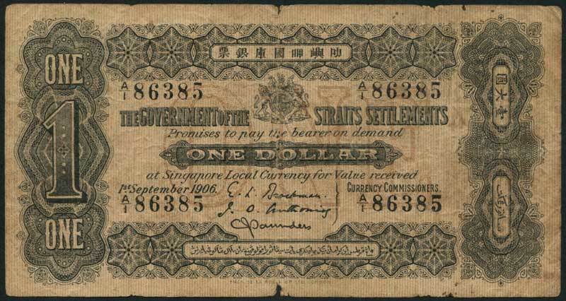 Government of the Straits Settlements, $1, 1 September 1906, serial number A/1 86385, black on yellow-brown, value in pale mauve underprint at centre, arms top centre, value at left and right, three printed signatures of Brockman, Anthonisz and Saunders below, reverse black and pale brown, tiger at centre, value and kris at left and right