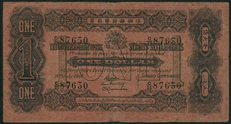 Government of the Straits Settlements, $1, 10 July 1916, serial number G/66 83604, black and red with value in green underprint at centre, arms top centre, value at left and right, signatures of James, Pountney and Saunders, reverse red, tiger at centre, value and kris at left and right