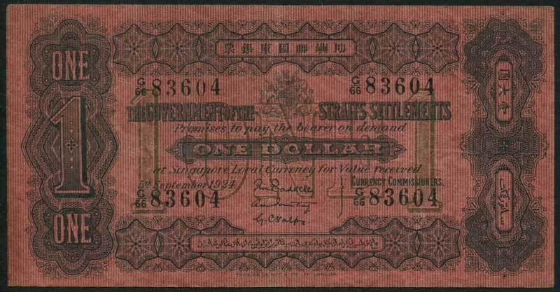 Government of the Straits Settlements, $1, 5 September 1924, serial number G/66 83604, black and pale red with value in green underprint at centre, arms top centre, value at left and right, signatures of Baddeley, Pountney and Valpy, reverse red, tiger at centre, value and kris at left and right