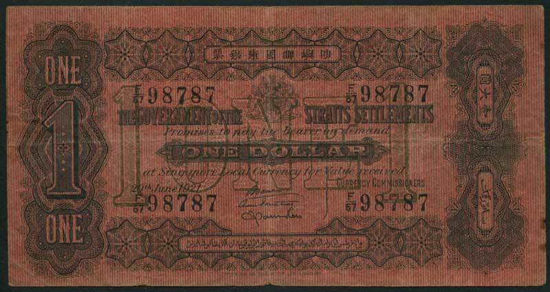 Government of the Straits Settlements, $1, 20 June 1921, serial number F/57 98787, black and pale red with value in green underprint at centre, arms top centre, value at left and right, signatures of James, Pountney and Saunders, reverse red, tiger at centre, value and kris at left and right